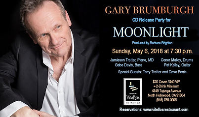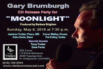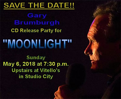 Following a frightening and difficult bout with neck and tonsil cancer, vocalist GARY BRUMBRUGH came through with his vocal chords and throat unaffected. Listen to Moonlight (Café Pacific Records), his eclectic 11-track album, and you would not hear any signs of his illness.